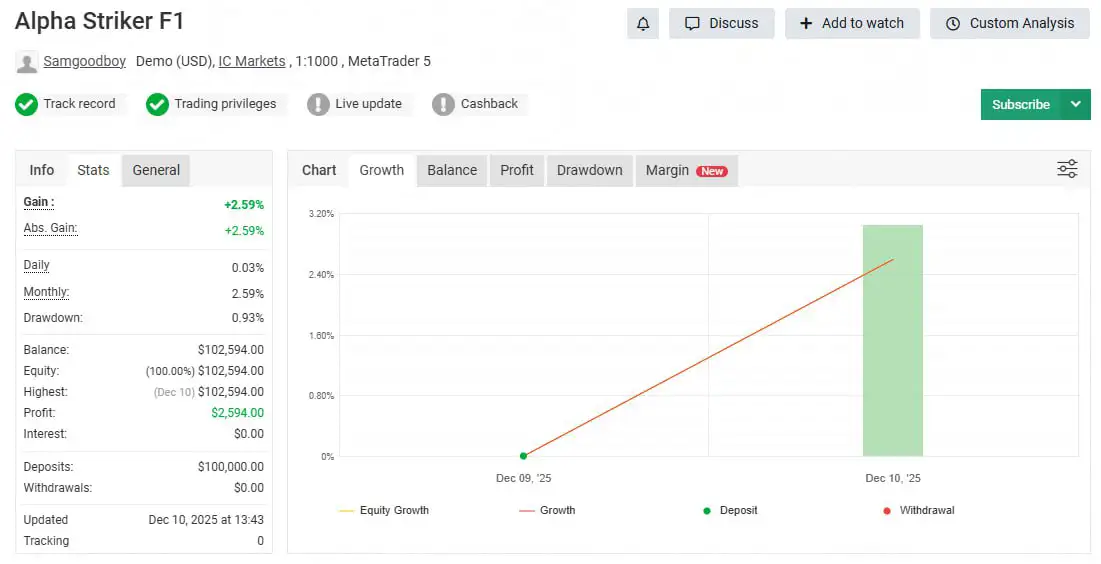 Instead, Alpha Striker F1 MT5 follows a clear and controlled strategy framework, ensuring each trade is executed based on predefined rules. This significantly reduces the likelihood of large drawdowns and promotes more stable account growth.