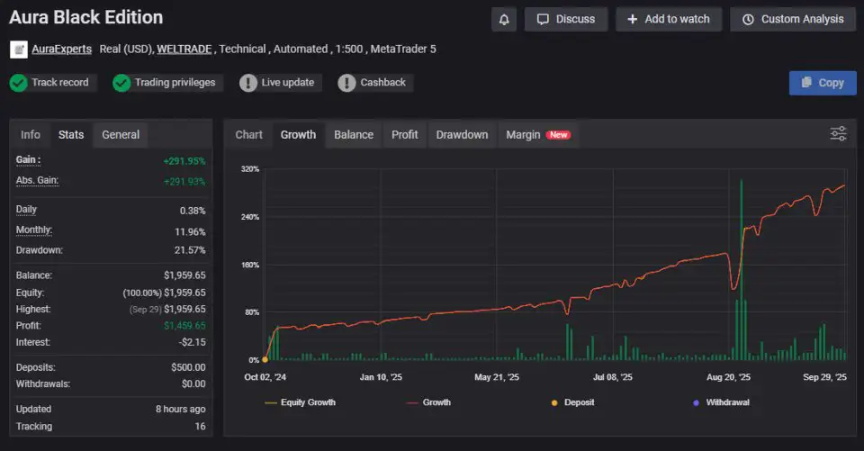 Aura Black Edition MT5 merges AI innovation with professional risk management, making it one of the most advanced gold trading EAs available today.