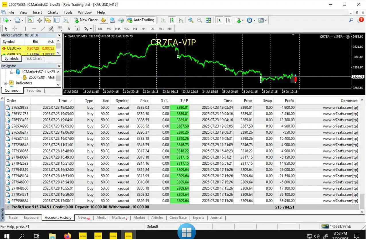 The CR7 VIP EA MT4 is a cutting-edge automated scalping trading robot designed exclusively for Gold (XAUUSD). Built for the MetaTrader 4 (MT4) platform, it delivers high-frequency trades on the M1 (1-minute) timeframe, making it the perfect solution for traders who want fast entries, precise exits, and consistent results in volatile gold markets.