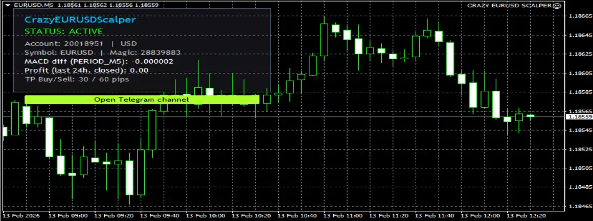 Crazy EURUSD Scalper MT4 was built with one clear objective: precision EUR/USD scalping on the M5 timeframe. By combining fast execution, strict strategy discipline, and optimized algorithmic logic, it offers a streamlined approach to automated Forex trading.