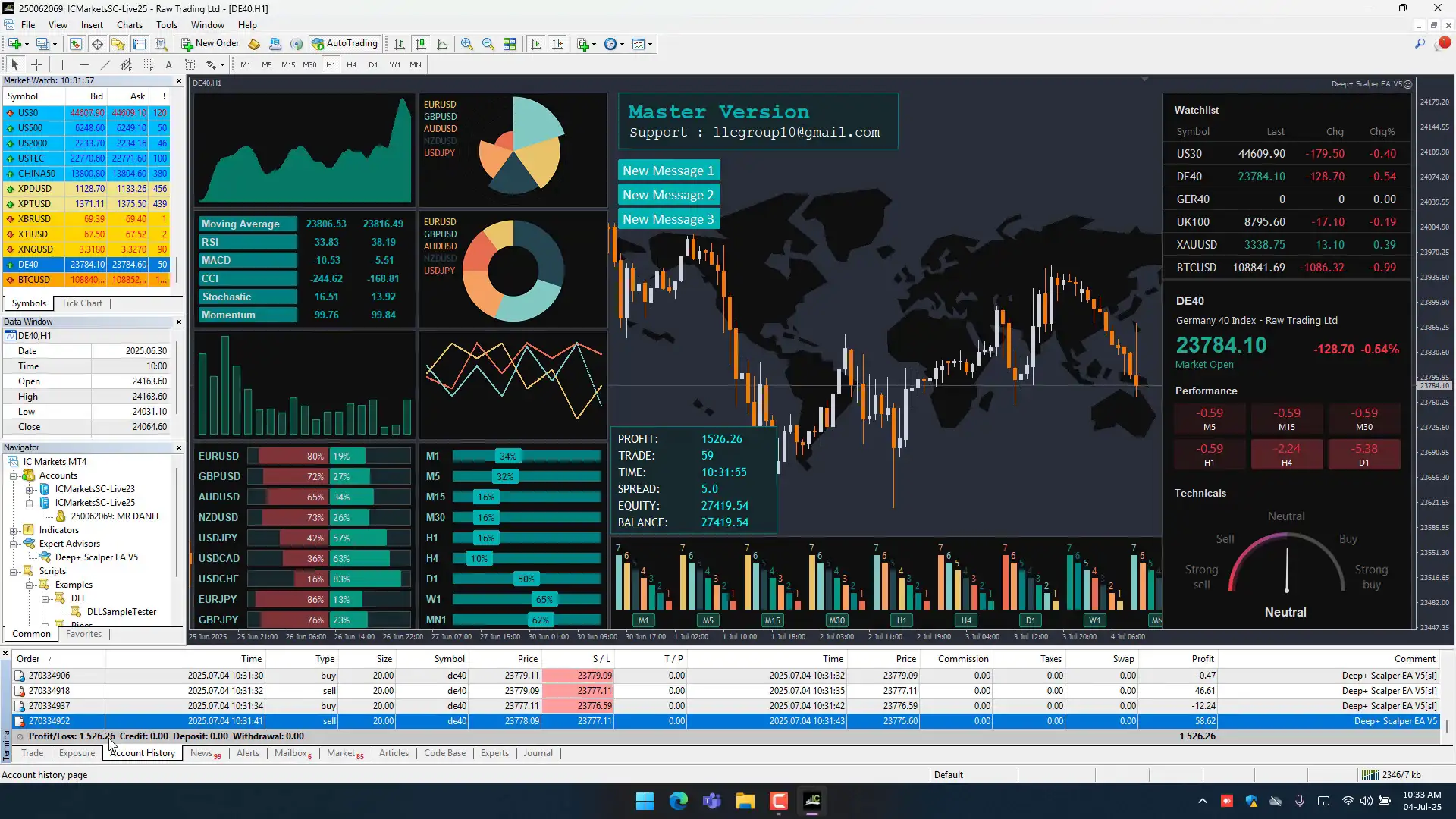 - Supported Symbols: US30, DE40, XAUUSD (Gold), BTCUSD (Bitcoin), and all major forex pairs