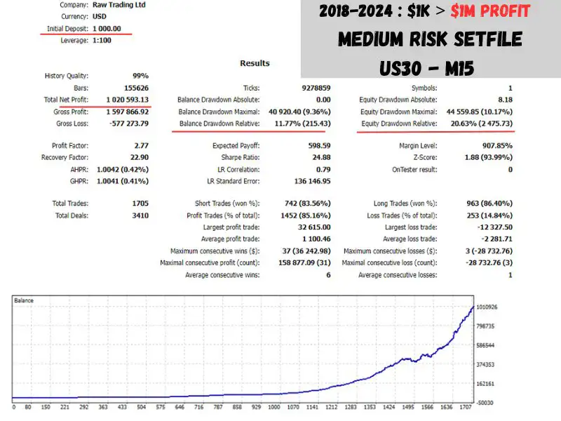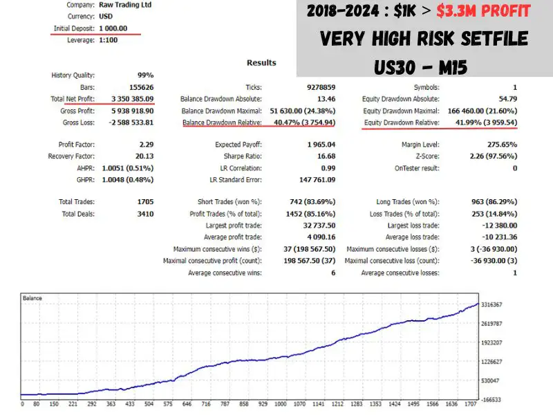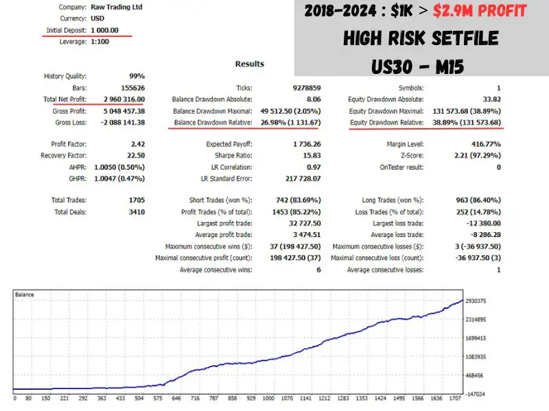 - Optimized for US30: Focuses exclusively on the US30 pair to maximize profit potential.
