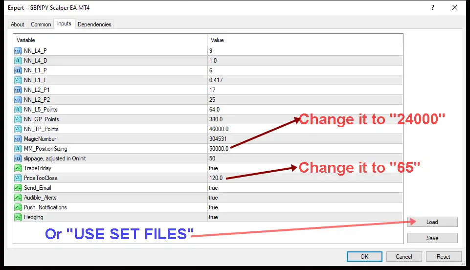 - Settings: Use the provided set files for different risk levels to match your trading goals and account type