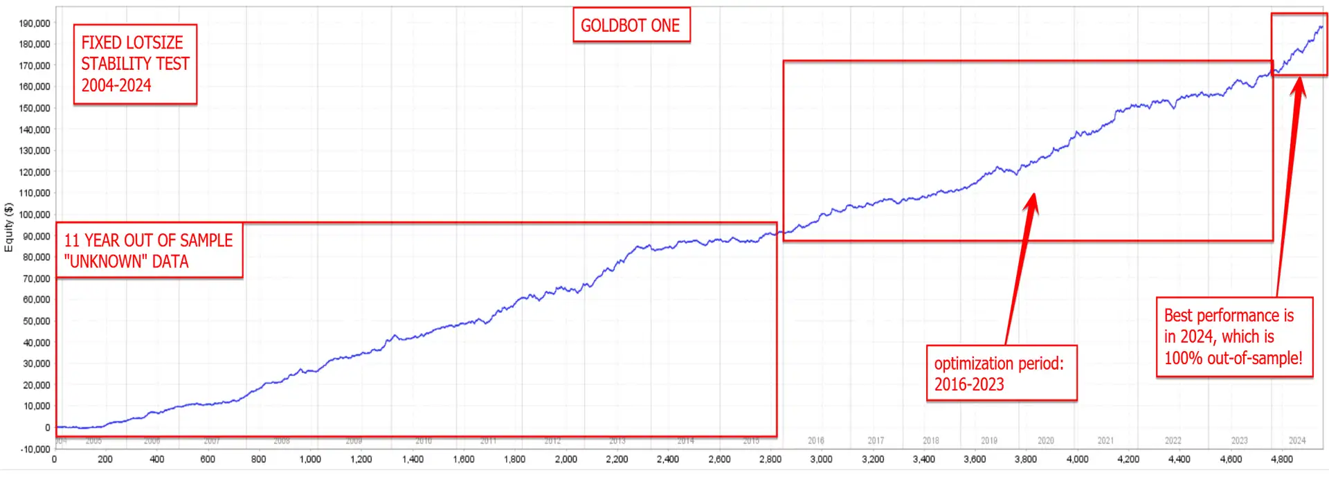 Goldbot One MT4 integrates eight optimized variations of a successful breakout strategy, each fine-tuned for different market conditions. This diversified strategy approach spreads risk and delivers smoother, more stable performance across changing gold price trends.