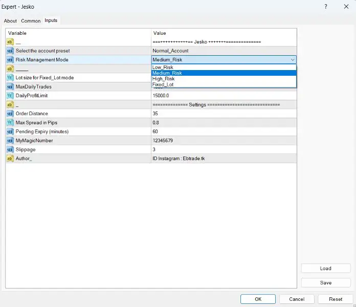 - RiskMode: Select from Low, Medium, or High risk levels.