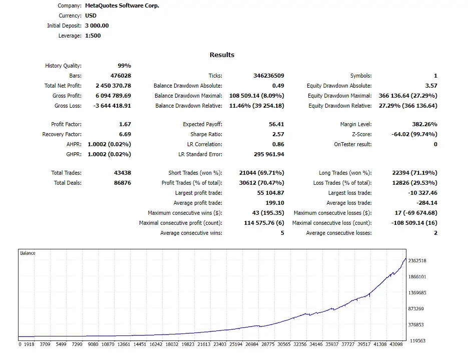 The Sharpshooter EA has undergone rigorous backtesting with 99.90% modeling quality, ensuring trustworthy and reliable results. Using accurate Dukascopy variable spread data, the EA is tested under real-market conditions, demonstrating consistent performance over two decades.