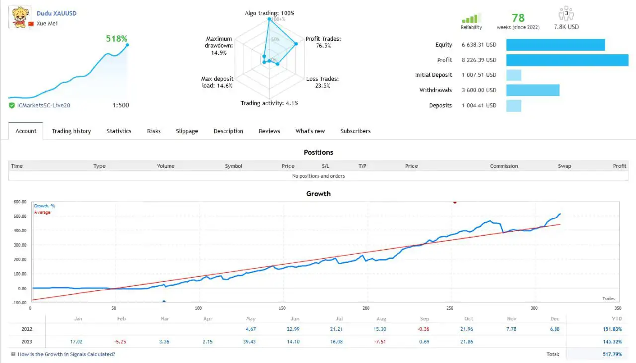 - On average, positions are held for approximately 2 hours, with a minimum leverage requirement of 200 for account security.