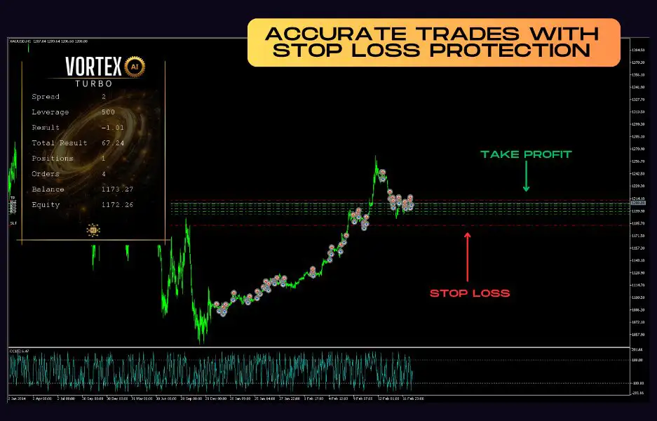 Although Vortex Turbo EA MT4 incorporates averaging and martingale mechanics, every trade includes: