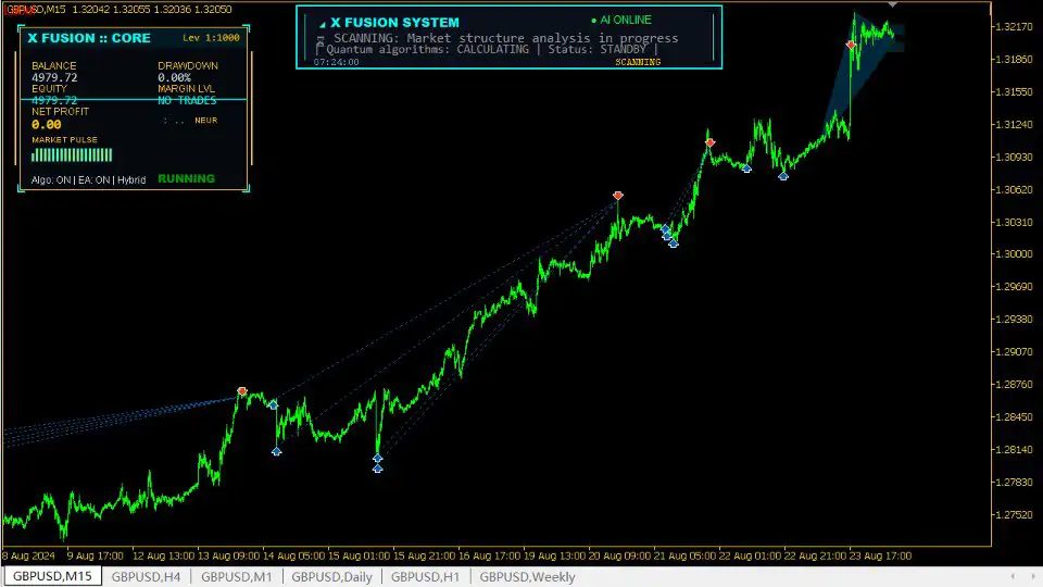 X Fusion AI MT5 is an advanced automated Forex trading system designed specifically for MetaTrader 5. This hybrid Expert Advisor combines classic, time-tested trading principles with a neural-like adaptive decision engine to create a flexible and structured trading solution.